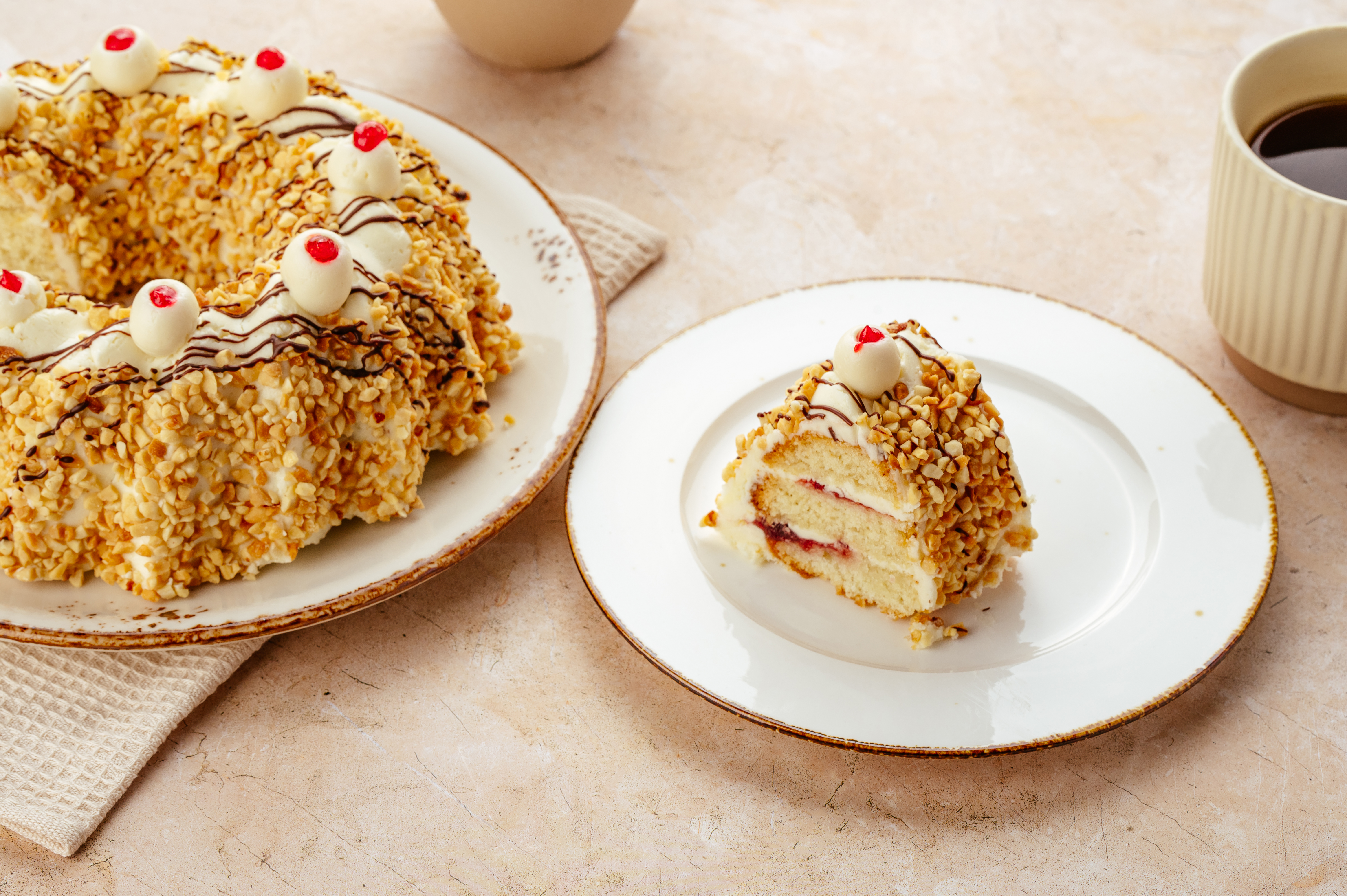 Сахар, масло сливочное, полуфабрикат. Начинка фруктовая «Клюква» нестерилизованная, ядро арахиса жареное дробленое, яйца куриные, мука пшеничная высшего сорта, молоко цельное сгущенное с сахаром, шоколадная глазурь, масло подсолнечное, крахмал картофельный, настойка горькая "Беловежская пуща", вино, КПД разрыхлитель теста "Линденер", соль пищевая выварочная сорт экстра, кислота лимонная, пудра ванильная, ароматизатор Ром, ароматизатор Ванилин, БАД бетулинсодержащий экстракт бересты.