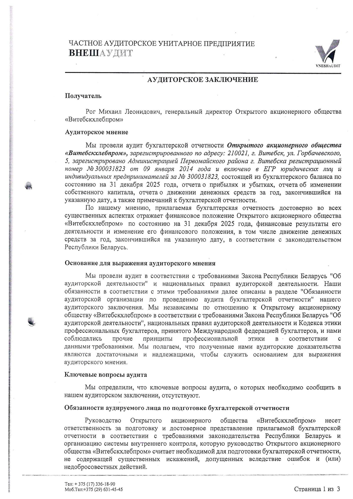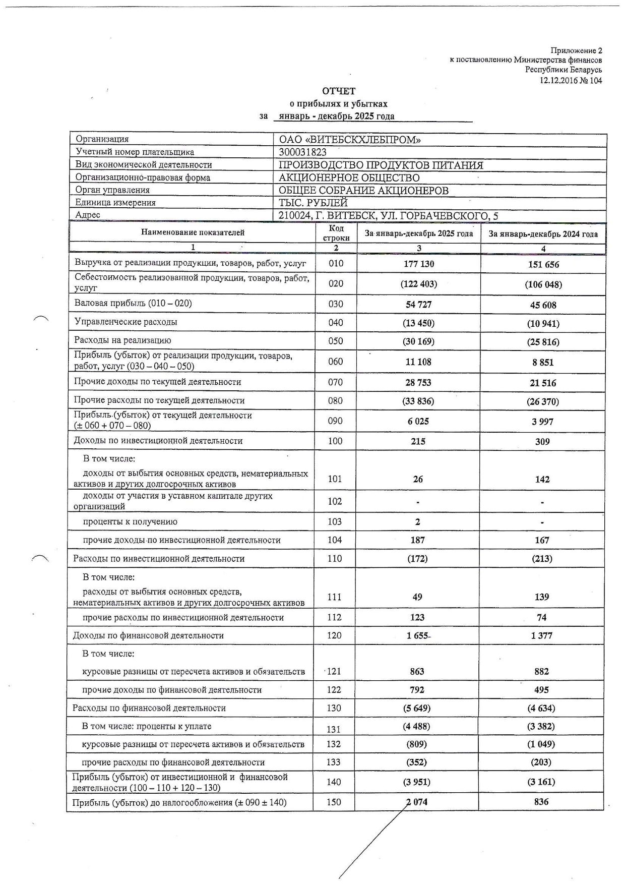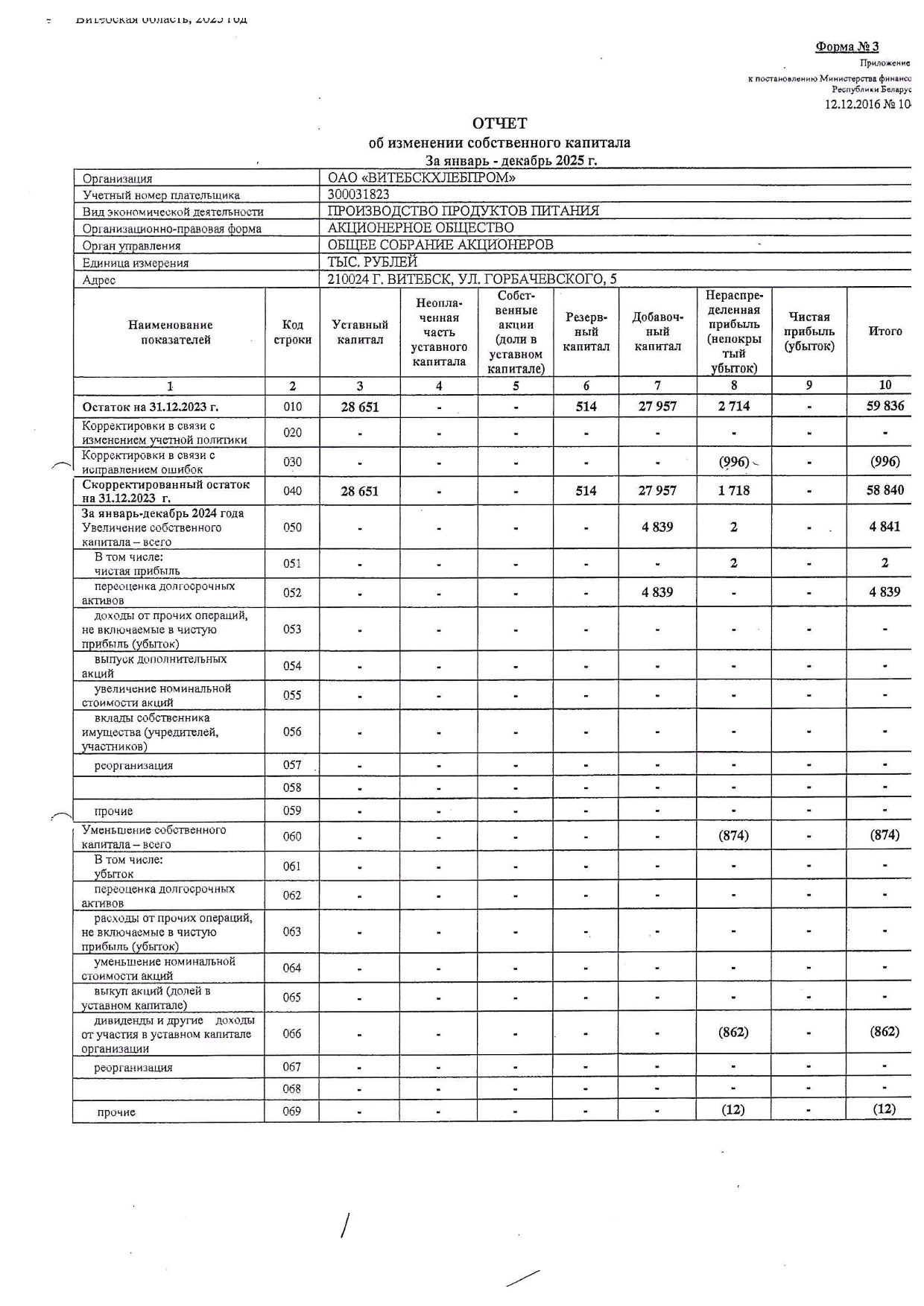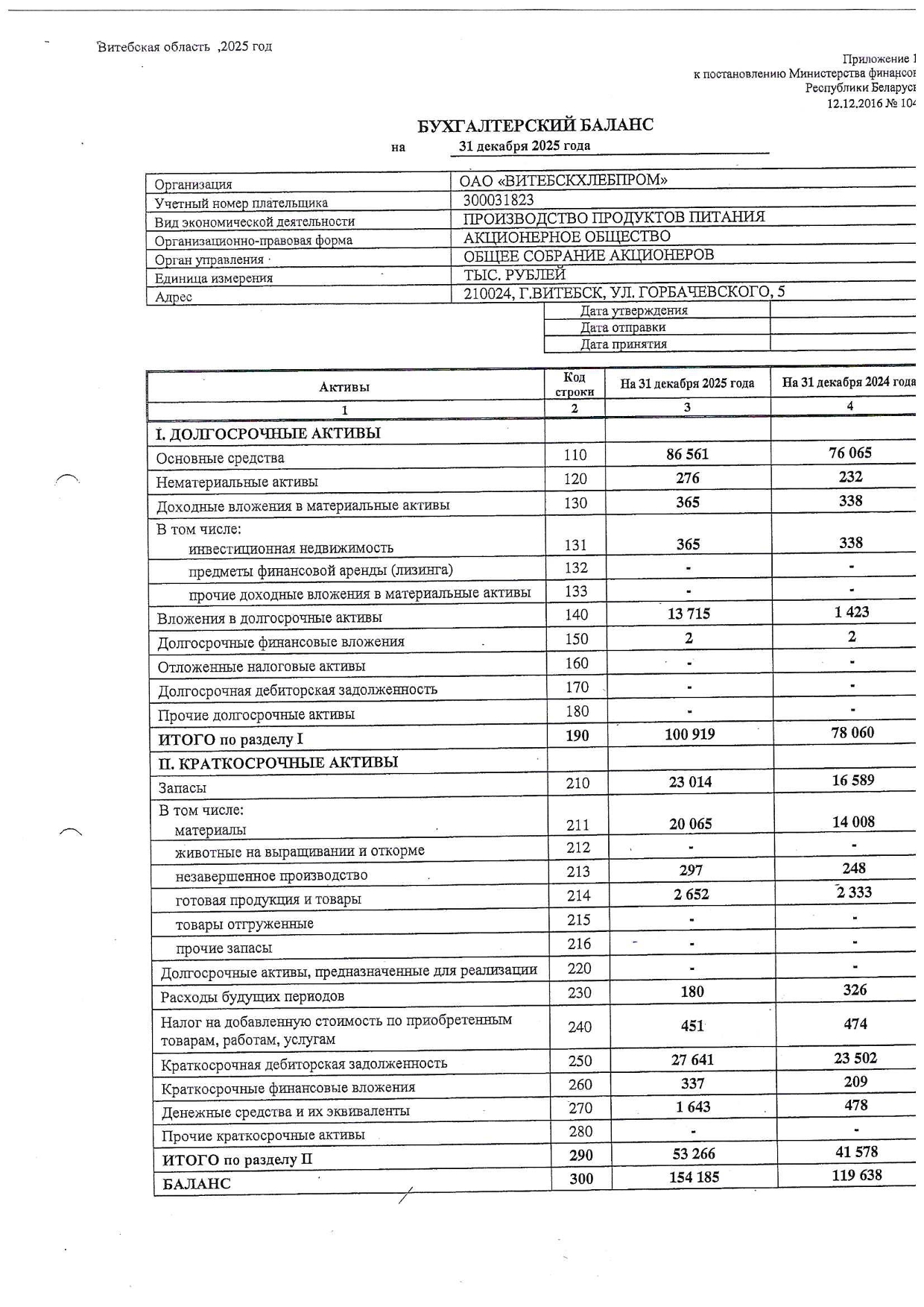 Примечания к бухгалтерской отчетности ОАО "Витебскхлебпром" за 2025г.