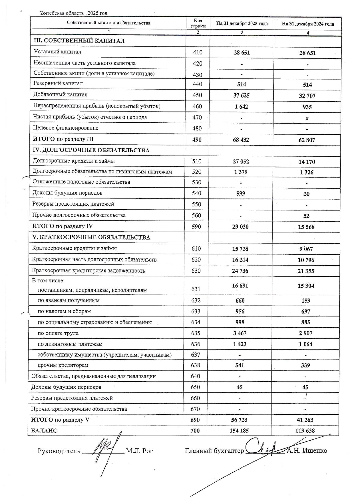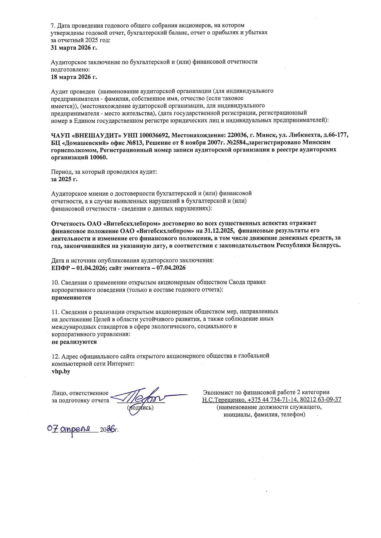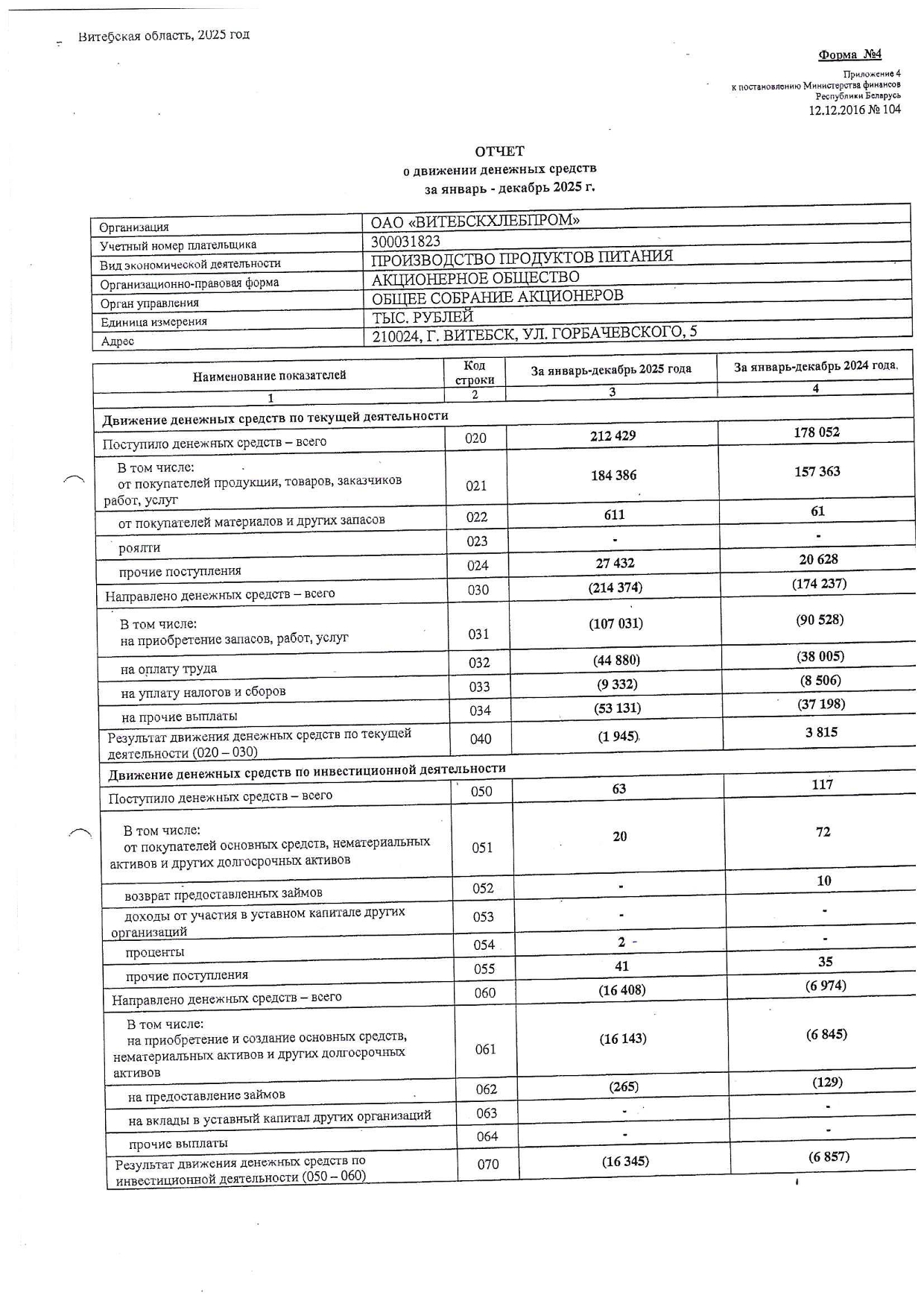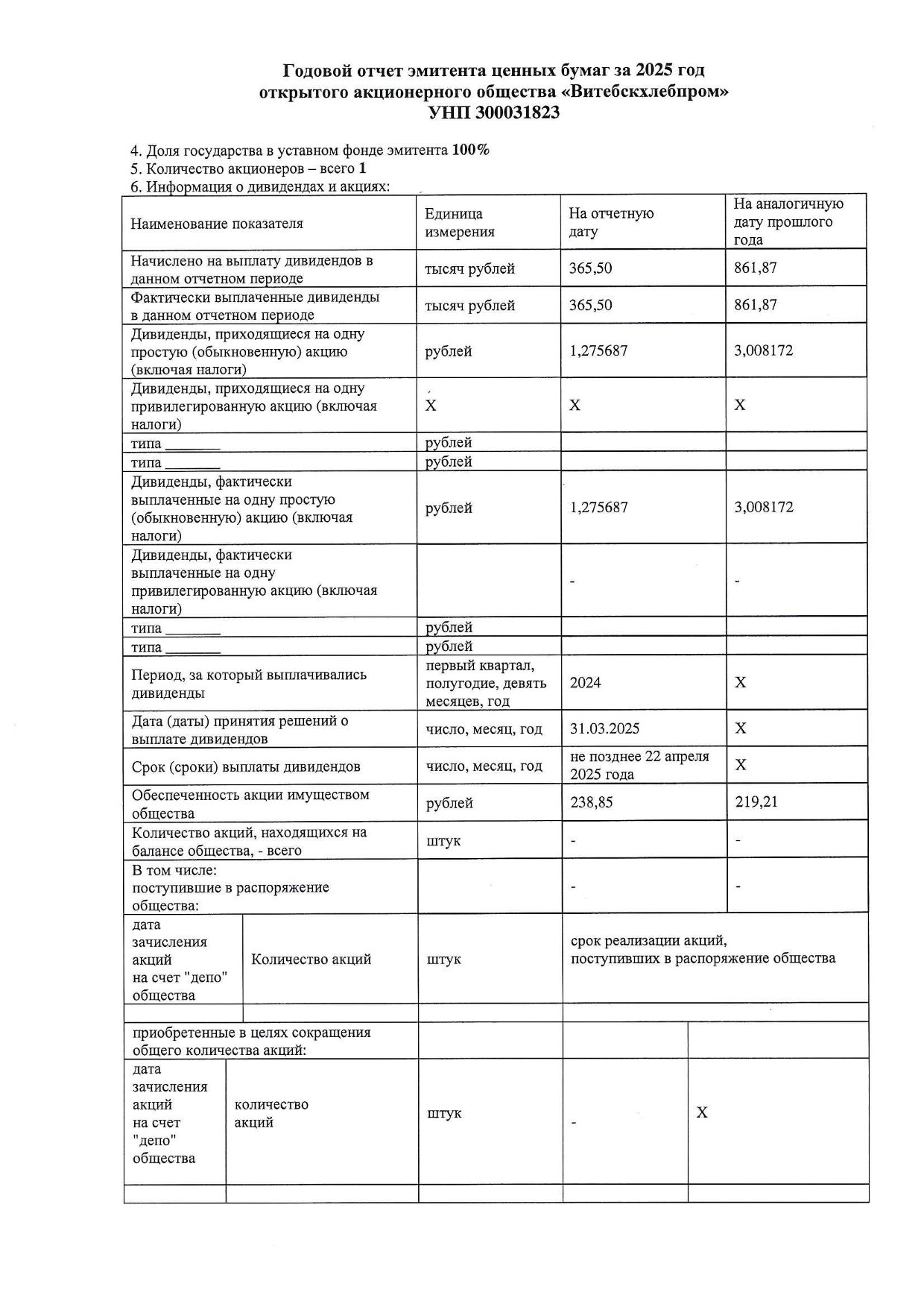 Примечания к бухгалтерской отчетности ОАО "Витебскхлебпром" за 2025г.